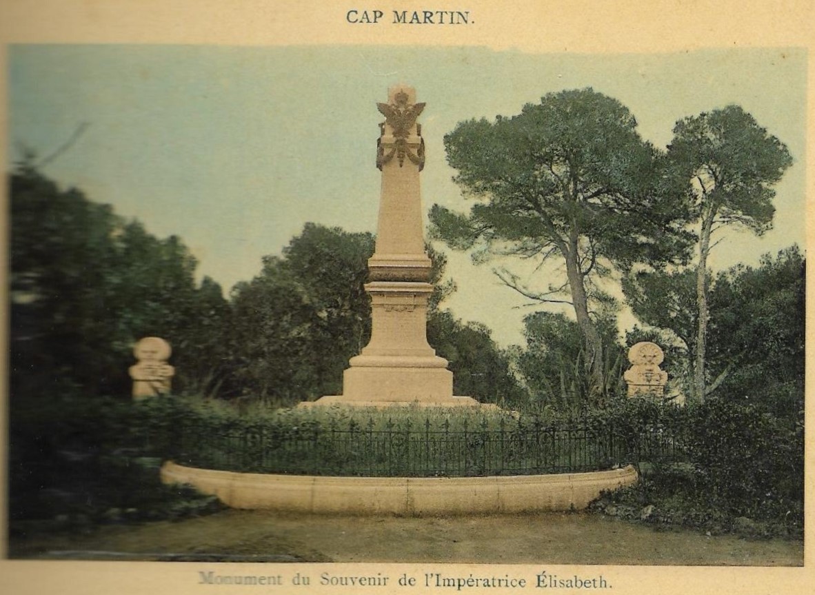 Ce monument, inauguré en 1899 commémore les fréquents séjours de l’impératrice Elisabeth d’Autriche au Cap Martin, soit au grand Hôtel du Cap, soit dans certaines villas. La date de ces séjours est indiquée en chiffre romains sous l’inscription principale, dans la partie haute de l’obélisque. Œuvre de l’architecte Hans Georg Tersling, cet édifice simple et harmonieux est mis en scène dans un environnement privilégié, entre la mer et les pins maritimes. Les derniers vers d’un poème de Mme de Montgomery sont gravés sur le stylobate de l’obélisque.Inscriptions : Sur l'obélisque : En souvenir du séjour au Cap Martin de Sa Majesté Elisabeth impératrice d'Autriche et reine de Hongrie MDCCCXCIV / MDCCCXCV / MDCCCXCVI / MDCCCXCVIIAu bas du piédestal : NOUS AVONS ELEVE CE TRES HUMBLE OBELISQUE O REINE ELISABETH CAR VOUS AIMIEZ LE SOIRA VENIR RESPIRER LA SENTEUR DU LENTISQUEET PARMI LES ROCHES PRES D’ICI VOUS ASSEOIRDAIGNIEZ DONC DE CE BOIS ETRE LA PROTECTRICELES FORETS AUTREFOIS APPARTENAIENT AUX DIEUXSOYEZ NOTRE GENIE O SAINTE IMPERATRICEET NOUS REVERRONS AU SEJOUR RADIEUXCAR NOUS NE CROYONS PAS AUX ETERNELS ADIEUXLa statue descellée, un article du Cri de Paris du 20 février 1916La statue descellée On se rappelle peut-être que l'impératrice Elisabeth d'Autriche fit de longs séjours au Cap Martin et, qu'après sa mort tragique, une statue de bronze fut élevée pour perpétuer son souvenir dans les jardins enchantés qu'elle aimait à parcourir.