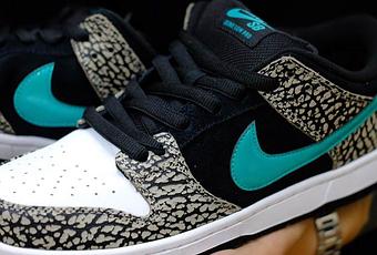 On retrouve le très réussi combo cuir, suede et empiècement printé Elephant, teinté avec les couleurs traditionnels du coloris, c’est à dire le blanc, le noir et le clear jade. Le shape musclé de la SB Dunk Low accueille à merveille le combo de ce mythique coloris. Cette nouvelle Nike SB Dunk Low Atmos Elephant verra le jour en novembre prochain sur le Nike Store.