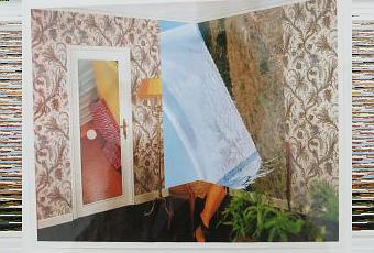 –Cécile Maulini, et ses petits collages délicats. Des intérieurs de logements, colorés joyeusement, où surviennent parfois des éléments incongrus, où les choses se renversent, se dédoublent, s’entrechoquent, se camouflent… Et, dans une peinture de la même artiste on retrouve les motifs genre « papier peint », vus dans ses collages, ainsi que des sortes de découpages qui rappellent aussi les collages. Un petit côté vintage, tout cela! Mais intéressant à suivre, avec ces rappels discrets du passé, ces cassures du quotidien…