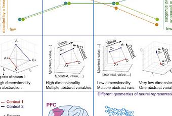 De son aspect dimensionnel provient la difficulté dans la mise au point de modèles de renforcement de l’apprentissage et de prise de décision. Le processus d’abstraction peut apporter une solution à ce problème par la construction de variables définissant les caractéristiques partagées dans différentes situations ; réduisant pour chacune d’entre elles l’impact de l’aspect dimensionnel et permettant ainsi la généralisation des modèles. Ici, nous avons caractérisé les représentations neurales chez les primates réalisant une tâche décrite par différentes variables cachées et explicites. L’abstraction a été définie sur le plan opérationnel à l’aide de la généralisation de la performance selon des décodeurs neuraux à travers des conditions d’application inutilisées lors d’entraînements, requérant l’utilisation d’une géométrie particulière des représentations neurales. Les ensembles neuronaux du cortex préfrontal, de l’hippocampe, et les réseaux neuraux simulés représentent simultanément de multiples variables dans une géométrie reflétant l’abstraction mais qui permettent également à un classifieur linéaire de décoder un grand nombre d’autres variables (haute dimensionnalité des signaux). De plus, cette géométrie pouvait changer en temps réel en relation avec les tâches et la performance. Ces résultats permettent de décrypter la manière dont le cerveau et les systèmes artificiels représentent des variables en format résumé tout en préservant les avantages conférés par la haute dimensionnalité des signaux. Silvia Bernardi, et al, dans Cell, publication en ligne en avant-première, 14 octobre 2020
