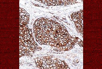Micrographie par immunocoloration d'un cancer du poumon non à petites cellules PD-L1 positif