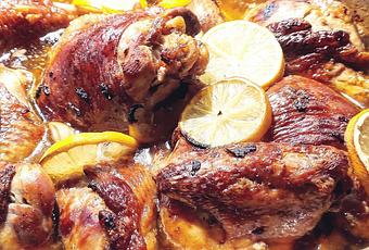 5. Ajouter le laurier et le thym sur le poulet, ajouter 5 cl d'eau puis enfourner 1h10