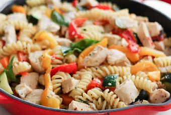 Ensuite retirez la poêle du feu, ajoutez le poulet dans la poêle, mélangez puis saupoudrez avec du parmesan râpé.
