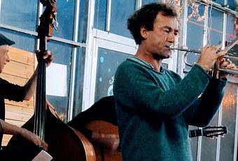 Sont six et pas tous inconnus: trompette : Marc Rosenfeld ( vu avec Lalilou Quartet et Couleur Jazz, il était passé à Tréveneuc avec le Blue Up Sextet, ce philosophe fait aussi partie de Treb Doo Wap/ flûte traversière et caisse en bandoulière : Erwan Tassel, vu il y a trois semaines à Ploumagoar/ saxophone ténor : Jacky Tertre ( Lalilou quartet, Couleur Jazz) / guitare : Morgan Bonnot, vu avec le Lonely Schmitt Quartet et membre de SomeSwing Else de la merveilleuse Marion Thomas/ seconde guitare : Pierre Lemarchand, prof de guitare à Rennes, dirige son propre trio et enfin, le plus petit et le plus vaillant à la contrebasse : Guillaume Jurkiewicz ( e a Leïla and the Koalas ou Awake).