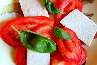 De bonnes tomates, du Mauxarella de GeorgianBay, du basilic, du poivre et de l'huile d'olive.