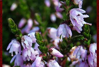Calluna vulgaris (Callune) : sous-arbrisseau à tiges ligneuses tortueuses ; feuilles opposées en formes d'écailles imbriquées sur 4 rangs ; sépales pétaloïdes libres formant un calice rose violacé plus long que la corolle, elle-même à pétales libres (ce qui la différencie des bruyères (Erica) dont les pétales sont soudés en grelot), petites bractées vertes formant un faux calice.