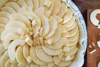 * on va s'occuper de préparer les pommes : les éplucher, enlever le trognon et les couper en fines tranches