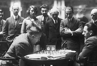 San Remo 1930 : Edgar Colle (à droite) contre Efim Bogoljubov, un prétendant au championnat du monde d'échecs.