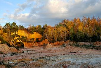 Juste une sablière, peut-être encore exploitée, un terrain de jeu pour ados en VTT, chiens en manque de course et bestioles sauvages en manque de terrain pour se dépenser. Novembre aime les jaunes souffreteux et les rouilles résistants, il tolère aussi les cramoisis à la fougue arrogante. Éventrées par les hommes avides, les strates exposent leurs surprenants dégradés colorés et leurs entrailles coulent en ravines. Canyon miniature entre des prairies où paissent des moutons. Au loin, deux ânes braient dans le couchant.