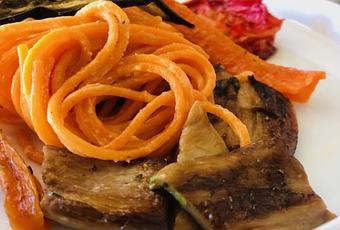 Les pâtes utilisées ici, sont des spaghettis au quinoa et à la tomate, d’où la couleur rouge mais bien sûr vous pouvez cuire des spaghettis classiques au blé.