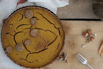 Préparer la pâte : Réduire les noisettes en poudre. Dans un saladier, mélanger la farine, les noisettes en poudre, le sucre et une pincée de sel. Ajouter la purée de noisette et l'huile de coco. Mélanger du bout des doigts pour obtenir un sable. Verser l'eau petit à petit, pour obtenir une boule de pâte. Envelopper la pâte dans un torchon et réserver au frais pour au moins 30 minutes.Faire cuire la pâte à blanc : Etaler la pâte sur le plan de travail fariné, en foncer un moule à tarte graissé. Piquer à la fourchette, lester de billes de céramique, de petits cailloux, de haricots ou de noyaux de cerise.Faire cuire la pâte à blanc à 180°C. pendant 10 minutes.Préparer la garniture : Dans un saladier ou le bol du mixer placer l'ensemble des ingrédients de la garniture. Mixer jusqu'à obtenir une texture homogène et onctueuse.Verser la garniture sur le fond de tarte cuit à blanc.Faire cuire la tarte une trentaine de minutes à 180°C., jusqu'à ce que la garniture soit prise. Laisser refroidir puis placer au frais. La tarte est meilleure le lendemain, lorsque les arômes ont bien pu se mêler et la texture se raffermir. Variante : On peut aussi utiliser l'appareil à la courge pour réaliser de petites crèmes, simplement en faisant cuire ce dernier versé dans de petits ramequins au four ou la vapeur pendant une vingtaine de minutes. Déguster tiède ou froid.