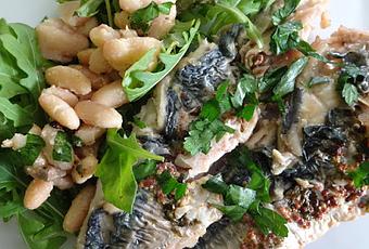 Servir avec une salade, ici roquette et salade de haricots cannellini, et verser le reste du beurre aromatisé réchauffé sur les poissons.