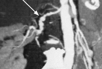 La dysplasie fibromusculaire atteint les tiers moyen et distal de l'artère et se caractérise par une structure moniliforme (sous forme de fil de perles) (voir image 12.1). Le critère angiographique de la thrombose ou de l'embolie de l'artère rénale - c'est son amputation au niveau du tronc vasculaire principal. L'anévrisme de l'artère rénale se manifeste sous forme de protrusion sacciforme ou fusiforme de la paroi vasculaire.