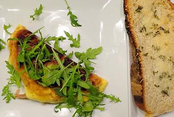 J'ai ajouté quelques feuilles de roquette pour cacher un peu que j'ai trop faire cuire l'omelette ..., elle doit à peine prendre de la couleur.