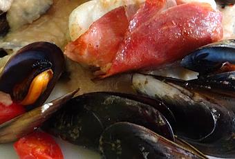 Dans des assiettes creuses, disposez de la purée de haricots tiède, 2 tronçons de lotte et quelques moules. Parsemez de sauge et de romarin ciselés.