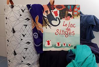 "Eh ben voilà qu'elle nous montre son linge sale ! On aura vraiment tout vu ! En plus, elle se trompe complètement : c'est Le lac de singes, le titre du livre, pas le sac de linge !" Non, non, je vous rassure, je sais encore lire et je n'ai pas l'intention de laver mon linge sale en public. Allez venez, je vous explique pourquoi cet album a atterri dans ma salle de bains !