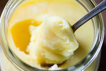 Une fois le beurre fondu, utilisez une cuillère, retirez doucement la couche superieure du beurre fondu - cette couche est blanche.