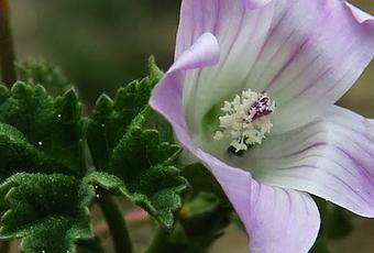 Malva neglecta (Mauve commune) : feuilles alternes à nervation palmée, peu lobées et souvent presque rondes ; calice doublé d'un calicule, formé de 3 pièces libres ; fleurs groupées à l'aisselle des feuilles, 5 pétales blanc rosâtre veinés de rose, légèrement soudés à la base.