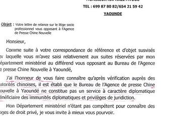 « J’ai l’honneur de vous faire connaître qu’après vérification auprès des Autorités chinoises, il est établi que le Bureau de l’Agence de presse Chine Nouvelle à Yaoundé ne constitue pas un service à caractère diplomatique bénéficiaire des immunités diplomatiques et privilèges de juridiction », souligne le contenu de la correspondance datée du 7 septembre et signée d’Adoum Gargoum, le ministre délégué auprès du ministre des Relations extérieures chargé du Monde islamique. « Mon département ministériel n’étant pas compétent pour connaître des litiges de droit privé, je vous invite à mieux vous pourvoir », conclut le membre du gouvernement, d’après le document dont Le Messager a