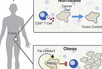 L'obésité inhibe l'action des cellules TCD8+ contrant la croissance des tumeurs. "Un blocage de la reprogrammation métabolique par les cellules tumorales chez les souris obèses améliore l'immunité anti-tumorale."