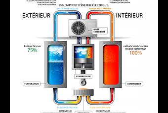Le fonctionnement d’un chauffage en aérothermie peut donc être mis en œuvre grâce à un module extérieur qui va permettre de capter directement les calories présentent dans l’air extérieur. Le module extérieur permet de capter ces calories grâce à un ventilateur. D’ailleurs les technologies actuelles permettent d’obtenir des modules qui ne génèrent plus de nuisances sonores qui fut durant longtemps un inconvénient majeur des solutions aérothermiques. Ces calories ainsi captées sont transmises à un fluide calorifugène. Ce fluide va permettre dans un premier temps le transport des calories captées. Ce fluide, sous l’action des calories va se dilater en changeant d’état. Ce changement d’état permet d’aboutir à une augmentation de la pression qui elle même va générer suffisamment de chaleur pour permettre de chauffer les pièces de vie d’une habitation. Cette chaleur générée est diffusé dans l’habitation soit grâce à un circuit d’eau de chauffage, soit grâce à des diffuseurs. On distingue d’ailleurs différentes solutions techniques s’appuyant sur l’aérothermie pour permettre de chauffer une habitation. On appel ces solutions des pompes à chaleur ou PAC. On parle de PAC air/eau qui permet de se raccorder directement au circuit de chauffage déjà existant ou la PAC air/air qui nécessite l’installation de « split » pour permettre la diffusion de la chaleur produite. La PAC air/eau apporte un réel intérêt lors de l’installation dans le cadre d’une rénovation énergétique car elle s’adapte directement au circuit de chauffage existant. Alors que la pompe à chaleur nécessite l’installation de diffuseurs dans les pièces a chauffer, elle profite généralement d’une caractéristique réversible qui apporte des capacités de régulation thermique complètes. La PAC air/air peut être aussi une solution de climatisation performante en plus d’apporter un chauffage écologique et économique. L’aérothermie profite d’un réel avantage économique puisqu’elle permet de diviser en moyenne par 4 la facture énergétique dédié au chauffage. On définie les performances d’une pompe à chaleur grâce au COP qui apporte une indication sur le rapport entre l’énergie consommée et l’énergie restituée. En moyenne le COP est de 4 ce qui signifie que la pompe à chaleur nécessite 1 kW pour 4 kW de chaleur produite.