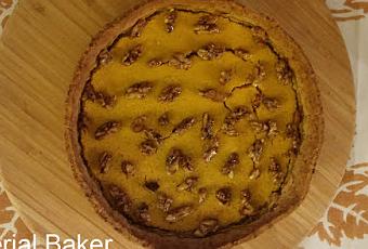 - 150g de purée de potimarron (cuit à la vapeur)- 1 oeuf + 1 jaune d'oeuf- 2 cuillères à soupe de sirop d'érable- 100 mL de crème végétale- 3 cm de racine de gingembre frais râpé- 1 zeste d'orange bio- 60 mL de jus d'orange Pour les noix caramélisées :- une douzaine de noix décortiquées- sirop d'érable (environ 3 cuillères à soupe)