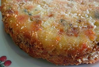 Eplucher les pommes de terre et les écraser légèrement à la fourchette, mélanger avec le grana et le pecorino râpé finement et le casera (remplacé par du comté jeune) râpé grossièrement