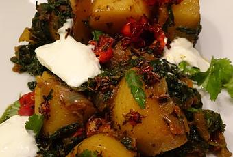 Servez les 6 portions de sag aloo arrosé d'huile parfumée, et garni d'1 cuillerée de yaourt