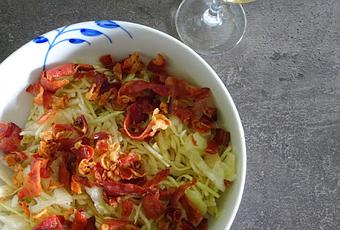 Servir la salade de chou avec les tranches de speck bien croustillantes.