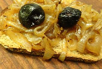 Répartir les oignons confits sur chaque tranche, ajouter les olives coupées en 2 et servir.