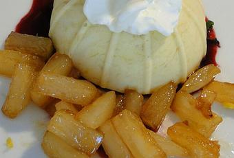 Un dessert joli, bon et léger : des demis domes de mangue avec des morceaux d’ananas rôti…