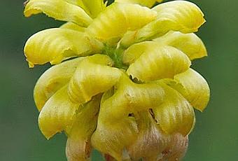 Trifolium campestre (Trèfle des champs) : feuilles à 3 folioles, la médiane pétiolée (ce qui le différencie de Trifolium aureum), stipules embrassantes ; fleurs jaunes à étendard strié rabattu en cuillère vers le bas, groupées en têtes peu allongées, sépales soudés à leur base, pétales plus ou moins soudés, filets de 9 étamines soudées, 1 étamine libre.