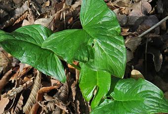 Arum maculatum (Arum tacheté) : feuilles en forme de pointe de flèche, tachetées de brun ou non ; fleurs en épi autour d'un axe charnu (spadice) surmonté d'une massue violette à brunâtre, spadice enveloppé dans une grande bractée (spathe) verte à jaunâtre, parfois ponctuée, grappe compacte de baies ovoïdes vertes, orange puis rouge brillant.