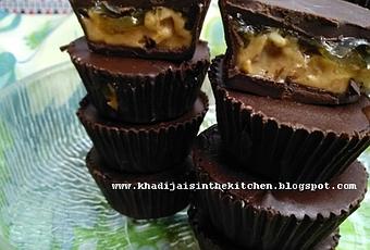 قطع الشوكولاتة محشية بزبدة الفول السوداني و المربىالمكونات:140 غرام شوكولاتة داكنة70 غرام مربى70 غرام زبدة الفول السودانيطريقة التحضير:1- توضع اكياس الكب كيك في قالب للكب كيك.2- تذاب الشوكولاتة في حمام مائي(بان ماري). تترك تبرد لمدة 15-20 دقيقة.3- تسكب نصف ملعقة كبيرة من الشوكولاتة في قاع كل كيس كب كيك. باستخدام ملعقة ، يغلف الجزء الداخلي من كيس الكب كيك بالشوكولاتة المذابة.4- يوضع قالب الكب كيك في الثلاجة لمدة 10-15 دقيقة حتى تصبح الشوكولاتة صلبة.5- تسكب نصف ملعقة كبيرة من زبدة الفول السوداني ونصف ملعقة كبيرة من المربى ثم الشوكولاتة المذابة كي تغطى زبدة الفول السوداني والمربى. يوضع قالب الكب كيك في الثلاجة حتى تتماسك الشوكولاتة. يخرج قالب الكب كيك من الثلاجة و تقشر اكياس الكب كيك عن الشوكولاتة.
