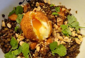 Dans les assiettes, déposez la salade de lentilles garnie avec les œufs ouverts en deux dessus.