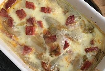 Pour changer des endives au jambon avec de la béchamel. Comme toujours, j'ai utilisé des endives de pleine terre. J'ai la chance de pouvoir en trouver. Le chorizo étant déjà salé ainsi que la cancoillotte, je n'ai pas ajouté de sel. Le chorizo ayant été acheté chez le charcutier si vous prenez celui vendu entier de la même épaisseur qu'une saucisse sèche, doubler la quantité.
