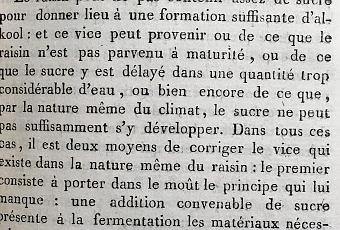 Chaptal précise que cette méthode est destinée à apporter au moût ce qu'il aurait dû avoir naturellement, mais n'a pu accumuler pour les diverses raisons qu'il indique.