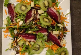 Servir la salade sur les assiettes et garnir avec tous les ingrédients.