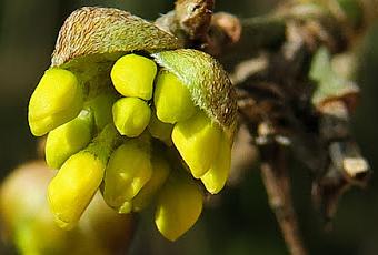Cornus mas (Cornouiller mâle) : arbuste à feuilles caduques et tronc lisse jaunâtre devenant écailleux ; bourgeons à 2-4 écailles pubescentes ; feuilles entières opposées ovales et pointues ; inflorescence en ombelle subsphérique, petites fleurs jaunes à 4 pétales et 4 étamines ; drupes ovoïdes rouges à maturité (cornouilles).