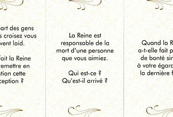 A votre tour, et dans le sens des aiguilles d’une montre, vous allez devoir tirer la première carte. Vous allez la lire à voix haute à l’assemblée et y répondre. Ensuite on passera au joueur suivant et ainsi de suite. Si à un moment vous ne souhaitez pas donner votre version ou ne trouvez rien à dire, vous pourrez utiliser la carte X. Attention, celle li ne sert qu’une fois dans la partie…. Arrivé en fin de partie, une question cruciale est posée : La Reine est attaquée, la défendez-vous ? Et c’est là qu’on va devoir se retrouver confronté à notre histoire pour choisir sa réponse.