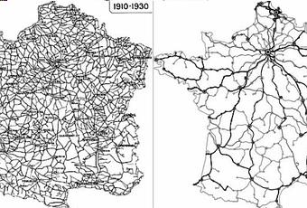 On a tous en tête ces 2 cartes du réseau ferré français, que ce soit en 1930 puis en 2014. Ca montre parfaitement l'abandon de voies de chemins de fer. Bien entendu, entre temps, il y a eu la libéralisation de la voiture, les trente glorieuses, etc. Ce n'est pas qu'une question de politique publique... mais quand même !