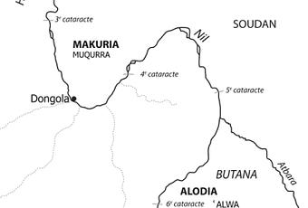 Après la destruction par les Axoumites du Royaume de Méroé, qui contrôla jusqu’au IIIème siècle le haut Nil de la première à la sixième cataracte [voir cartes ci-dessous ↓], trois royaumes émergent : du nord au sud, Nobatia (dont le nom vient des Nobates, tribus païennes de pasteurs installés dans le sud de l’Égypte), Maqurra et Alodia (ou Aloa) dont les capitales respectives sont Faras, Dongola et Soba. Ces royaumes combinent, comme Méroé, les traditions égyptiennes et nubiennes avec des influences coptes venues d’Alexandrie. La diffusion du christianisme y est importante à partir du VIème siècle, mais dès le VIIème siècle, ils sont confrontés à l’islamisation de l’Égypte. Ils négocient alors le maintien de leur indépendance en échange d’un tribut annuel. Au VIIIème siècle, les deux royaumes du nord s’unifient et les deux États, Dongola et Soba, connaissent une réelle prospérité jusqu’au début du XIIIème siècle. Leurs relations avec les sultans fatimides sont excellentes au XIIème siècle [notamment grâce à l’influence du haut-fonctionnariat chrétien arménien sur cette dynastie (fatimide) chiite atypique]. Les souverains s’appuient sur une Église copte florissante, qui a laissé nombre de basiliques et de monastères (par exemple à Faras). Un commerce actif se développe avec l’Égypte, mais aussi avec le Soudan central et la côte de la mer Rouge : les exportations d’or, d’ivoire et de peaux venant de Nubie sont réputées. Il anime un réseau de villes prospères qui sont des centres à la fois politico-religieux et économiques. Au XIVème siècle, l’Égypte réussit à assujettir la région qui, dès lors, s’arabise et s’islamise. Le royaume de Dongola disparaît complètement vers 1350 et celui de Soba au début du XVIème siècle.