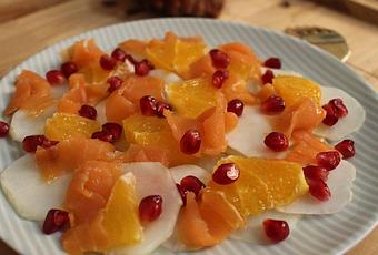 Disposer sur une assiette rondelles de topinambours, orange et saumon, assaisonner avec la vinaigrette et parsemer d'arilles
