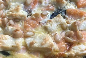 Dans un cul de poule battre les œufs avec la crème fraîche, saler et poivrer, ajouter les épinards et mettre cette préparation sur la pâte, ajouter les morceaux de saumon, la fêta émiettée et les pignons de pin et cuire environ 35 mn.