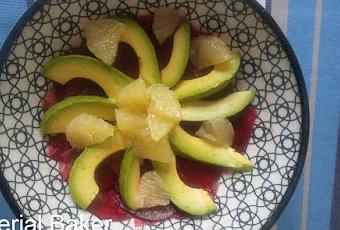Ingrédients (pour 2 parts)- 1 betterave crue de taille moyenne- 1 avocat mûr- 1 citron- huile d'olive- vinaigre de XérèsEplucher la betterave. Avec une mandoline, détailler des tranches de 2 mm d'épaisseur.Faire bouillir de l'eau dans une grande casserole. Y plonger les tranches de betterave, et laisser cuire 3 min (pas plus, sinon ce serait trop cuit), en remuant de temps en temps. Egoutter et laisser refroidir un peu. Placer les tranches de betterave tièdes dans un saladier avec 1 cuillère à soupe d'huile d'olive et une cuillère à café de vinaigre. Mélanger délicatement pour imprégner toutes les tranches. Laisser mariner un minimum de 15 minutes.Prélever la chair de l'avocat et la détailler en tranches.Couper le citron en deux. Sur un demi-citron, prélever les suprêmes (la chair sans les membranes blanches).Dans le saladier des betteraves, presser le jus du demi-citron, ajouter les tranches d'avocat et les suprêmes de citron. Saler.Mélanger et servir.