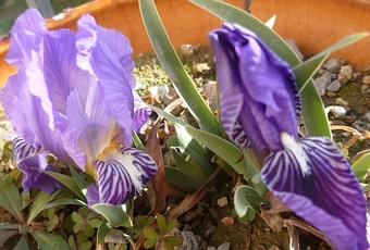 En attendant de préparer une nouvelle note, je mets d'autres photos plus récentes : iris sauvages (de garrigue et nains) dans un pot sur ma terrasse, et les primevères encore plus épanouies.