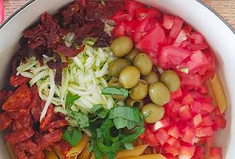 * on prend notre faitout : et on met : les pates, les tomates, olives, le chorizo, le poivron, la courgette, les olives, la feta et les feuilles de basilic (on garde la crème fraiche pour la fin de la cuisson).