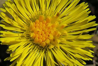 Tussilago farfara (Tussilage, pas-d'âne) : herbacée à feuilles basilaires apparaissant après les fleurs et dont la forme évoque celle du sabot de l'âne ; tige florale portant de petites feuilles écailleuses brunâtres, capitule terminal jaune.
