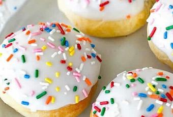 Ensuite trempez le dessus de chaque brioche dans le glaçage au sucre et faites-les garnir de pépites sucrées.