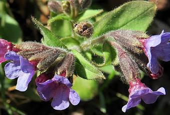 Pulmonaria montana (Pulmonaire des montagnes) : plante pourvue de poils étalés et de poils glanduleux ; feuilles caulinaires à base cordée, feuilles basilaires d'été ovales elliptiques, à limbe progressivement rétréci en pétiole, feuilles non maculées ; fleurs en entonnoir, rouges devenant bleues, en têtes denses.